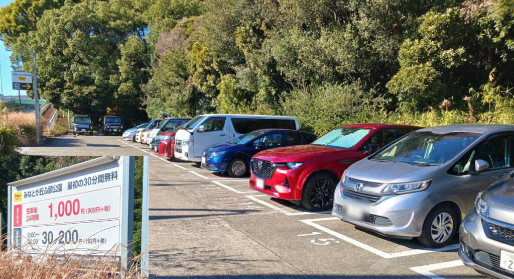 品川区八潮にあるみなとが丘ふ頭公園の駐車場に到着です。公園駐車場は1箇所のみになります。最初の30分は無料で、それ以降30分ごとに200円になります。24時間最大1000円になります。車は全18台停めることが出来ます。