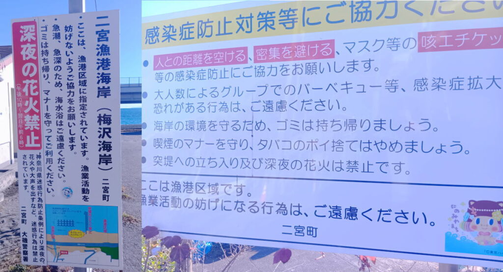 二宮町梅沢海岸に入る手前あたりあった看板です。漁港区域の為、漁業活動を妨げるような行為は、ご遠慮くださいとのことです。こちらのスポットでBBQをする方は、邪魔にならない程度の少人数ですることをおすすめ致します。