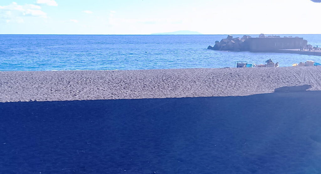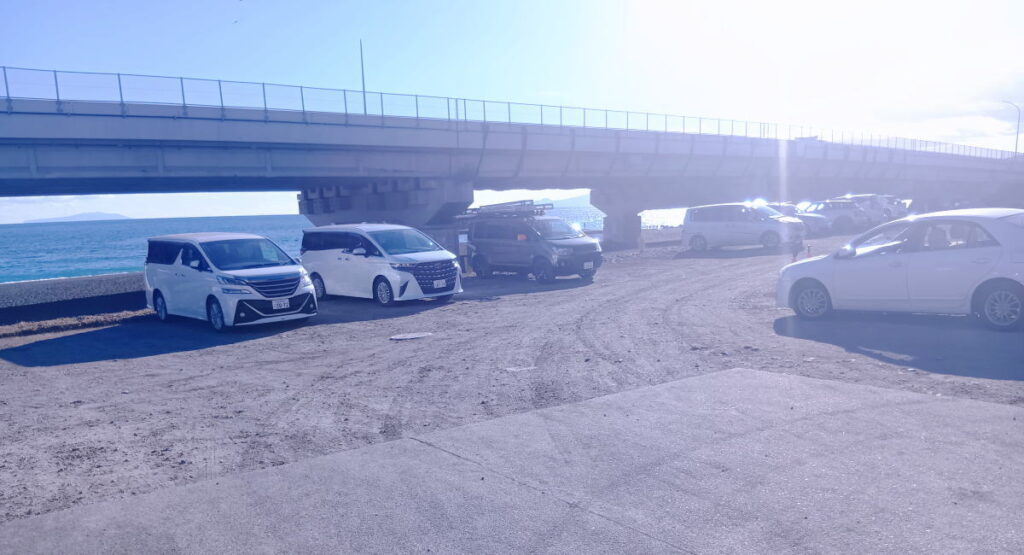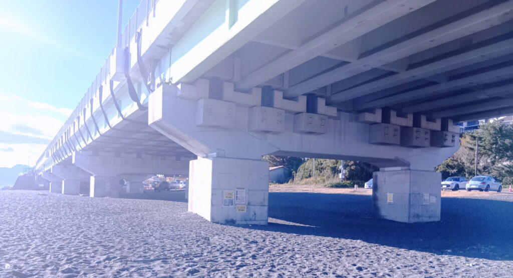 堤防があり、釣りをされている方が多くみられます。バイパス下から海を見ると、水平線の向こうにうっすらと伊豆大島が見えました。開放感がある海岸だと思います。