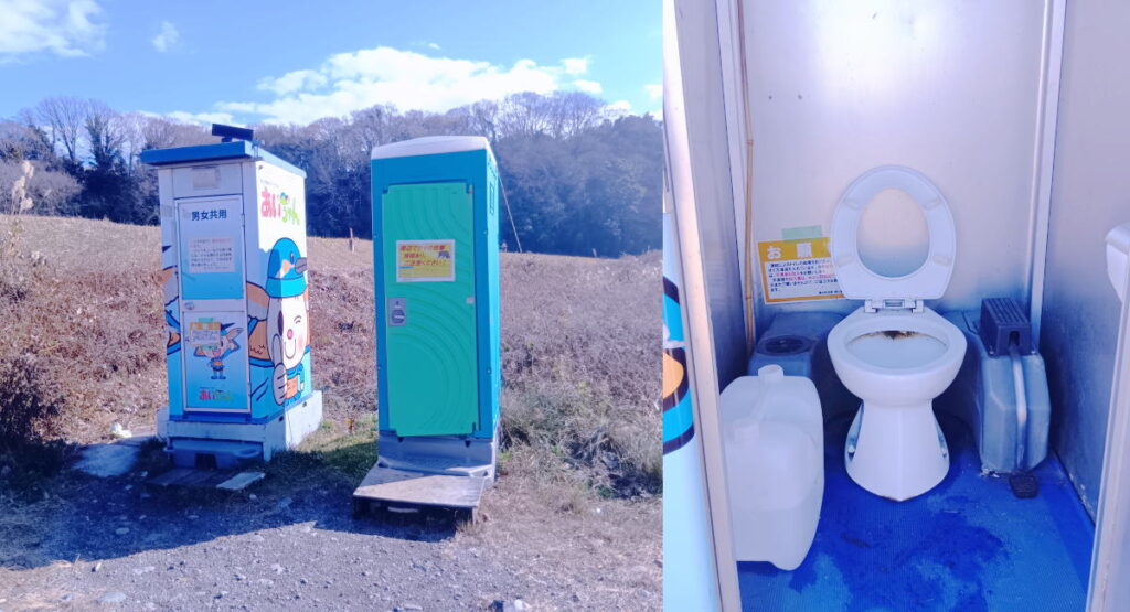 気になるトイレは2基設置されていました。中を覗いて見ると、こんな感じです。無料で利用できるので、文句は言えません。汚れすぎていて、使えないという事もなさそうです。