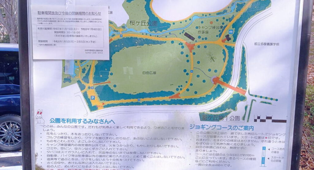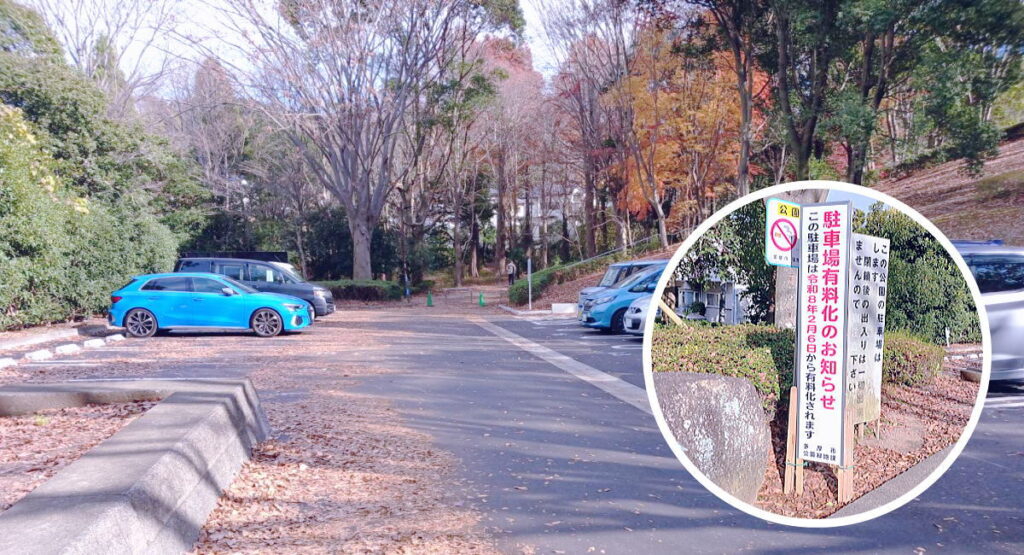 多摩市大谷戸公園の無料駐車場です。停められても20台くらいと言ったところでしょう。近隣にも有料の駐車場があります。看板を見ると令和8年2月6日から有料化されるようです。