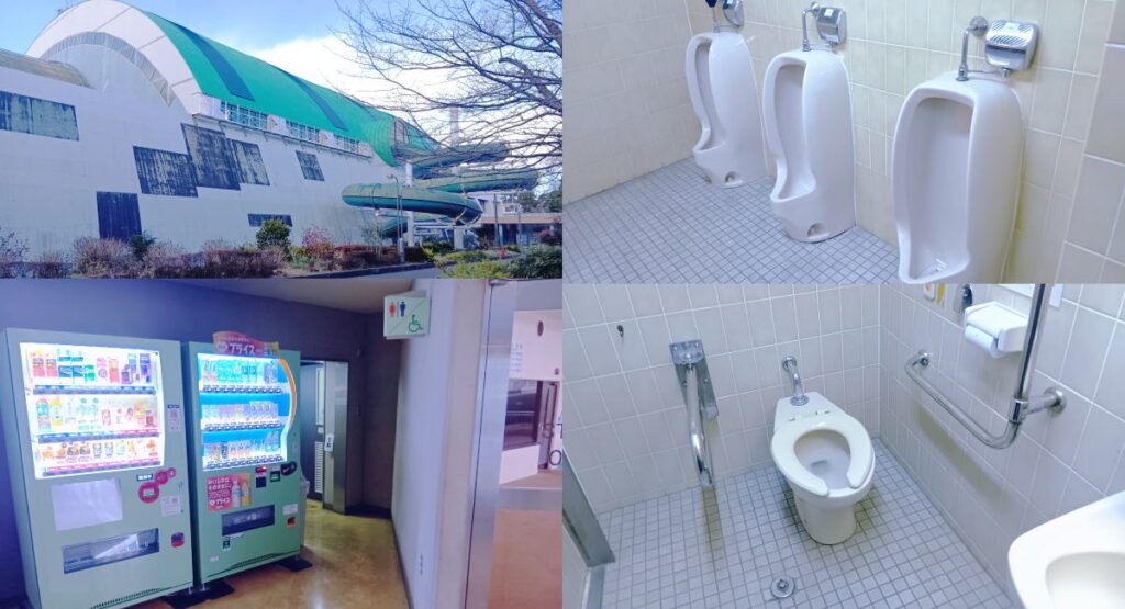 BBQが出来るエリアは南東の芝生広場の一角なのですが、ちょっと公園を探索します。正門から公園管理事務所を通り過ぎ、北側駐車場から近い、屋内プール施設があります。中に入ってみると、自由スペースなどがあり、多数の自動販売機が設置されています。館内のトイレはこの通り、綺麗でした。