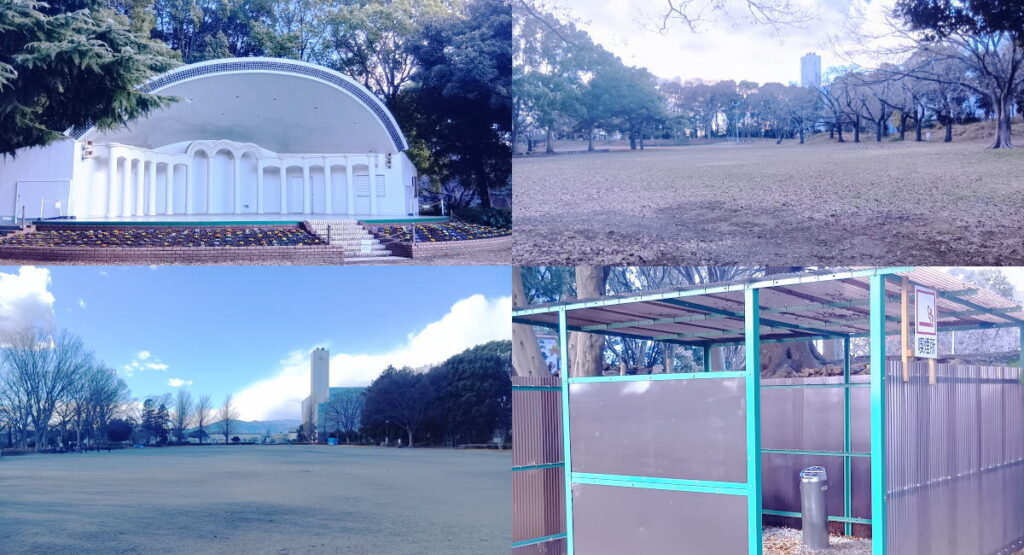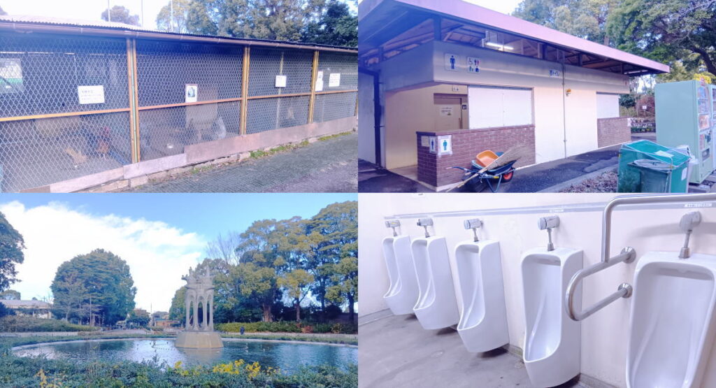プールの横当たりある、屋外トイレと、動物と触れ合うことができる、ふれあいの小経があります。鶏が何匹がいました。トイレ前にも自動販売機が多数設置されています。再び噴水池から南側の方へ歩き始めると、今度は大きな舞台が見えて来ます。合唱やイベントなどがあるのでしょう。