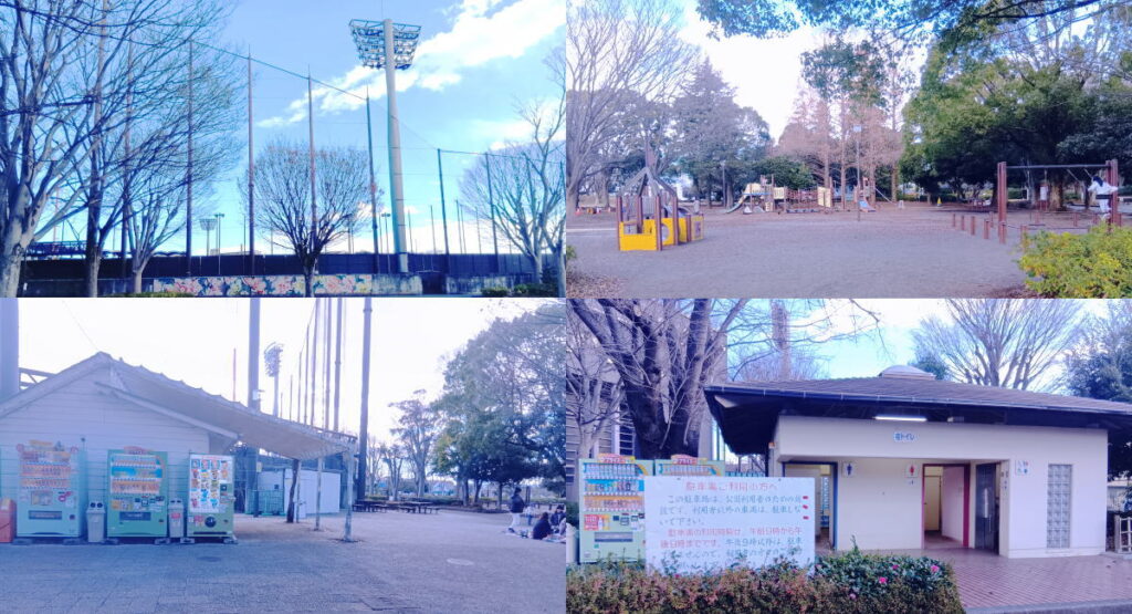 南側にも屋外トイレがありました。中は、他のトイレと全く同じように綺麗に清掃されています。広いスタジアムが見えています。公園中央あたりまで戻ると、子供が遊べる遊具広場があります。スタジアム側には、自動販売機が多数設置されています。
