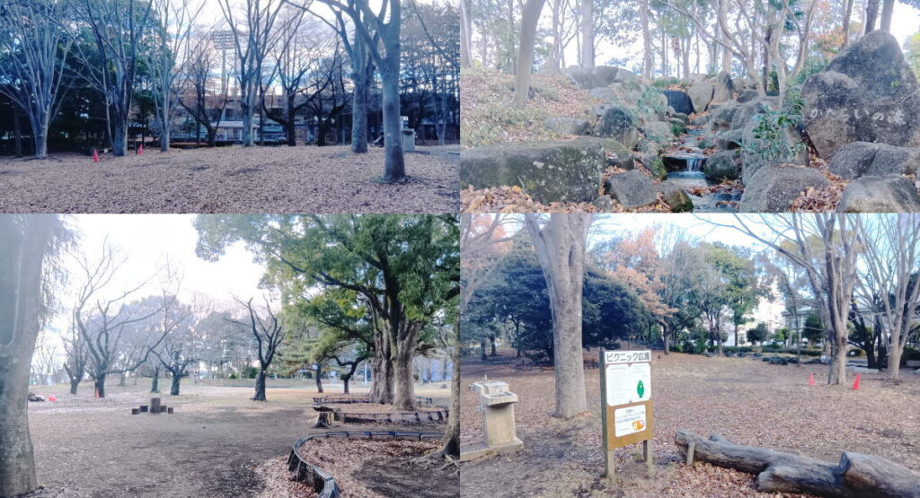 北側へ戻る途中にあるピクニック広場とかたらいの滝、先ほどとは違って、静かな雰囲気のある広場です。12月、寒いせいか人はいませんでした。紅葉なども綺麗そうなスポットです。