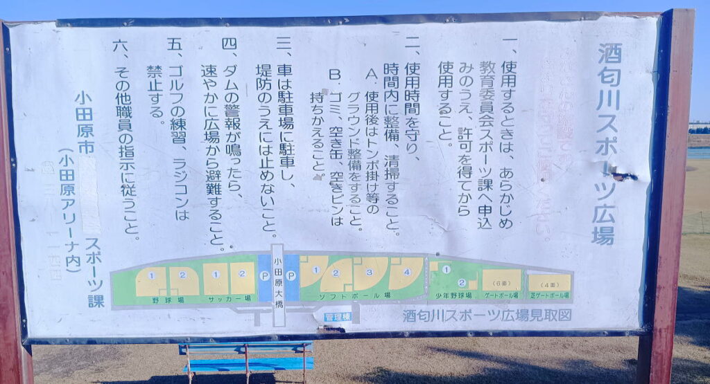 酒匂川スポーツ広場での禁止事項が記載された看板です。どこでもそうだと思いますが、基本的に直火や焚火などは禁止、ゴミなどは持ち帰らないとなりません。
