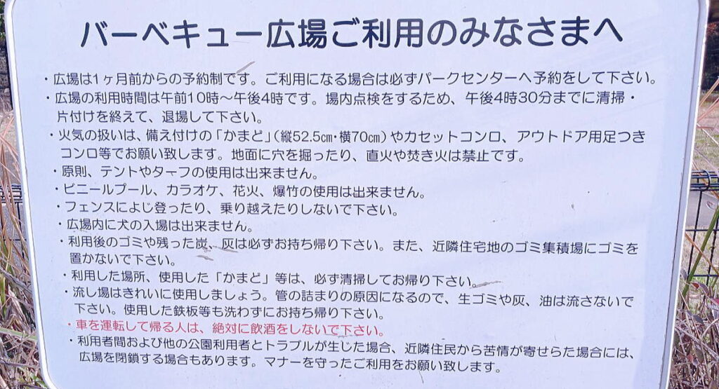 バーベキュー広場の利用は1か月前からの予約制です。午前10時~午後4時まで、無料で利用できます。直火、焚火は禁止です。ゴミのポイ捨てなども当然禁止ですね。利用者は、しっかりゴミを持ち帰らないとなりません。