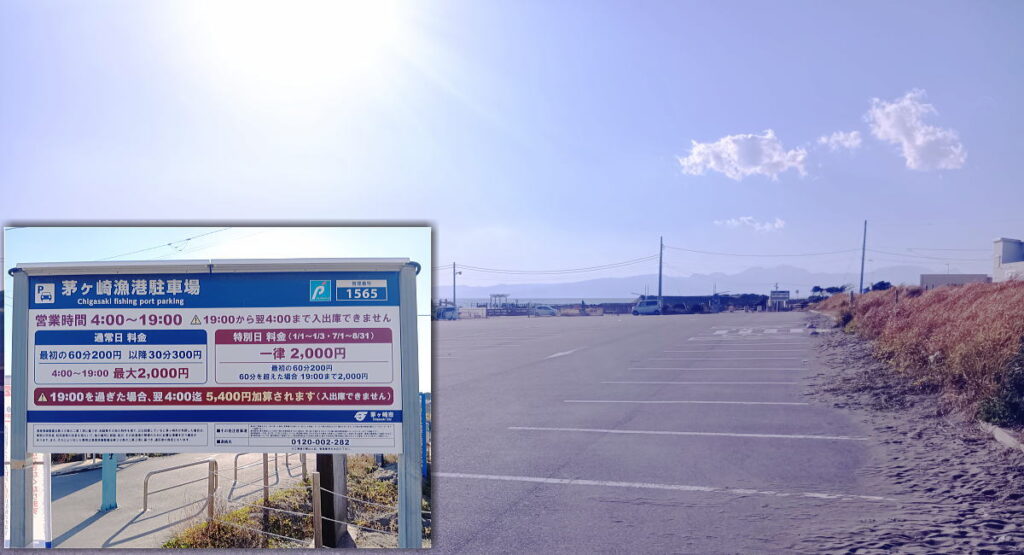車の場合、海岸へ曲がれる道ならどこでも大丈夫です。3カ所ありました。西浜小学校入口の信号を左折すると、先に駐車場が見えます。海岸へはこちらの駐車場が一番近く、安くて便利でした。※車から降りて歩いて撮影しています。