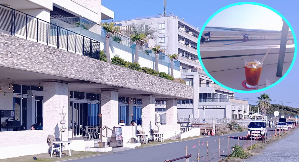 ビーチ横にはオシャレなカフェや飲食店が立ち並んでいて、おしゃれなカフェのパラソル下でちょっぴり一休みできます。平日の昼頃でも多くの方がいらっしゃいます。