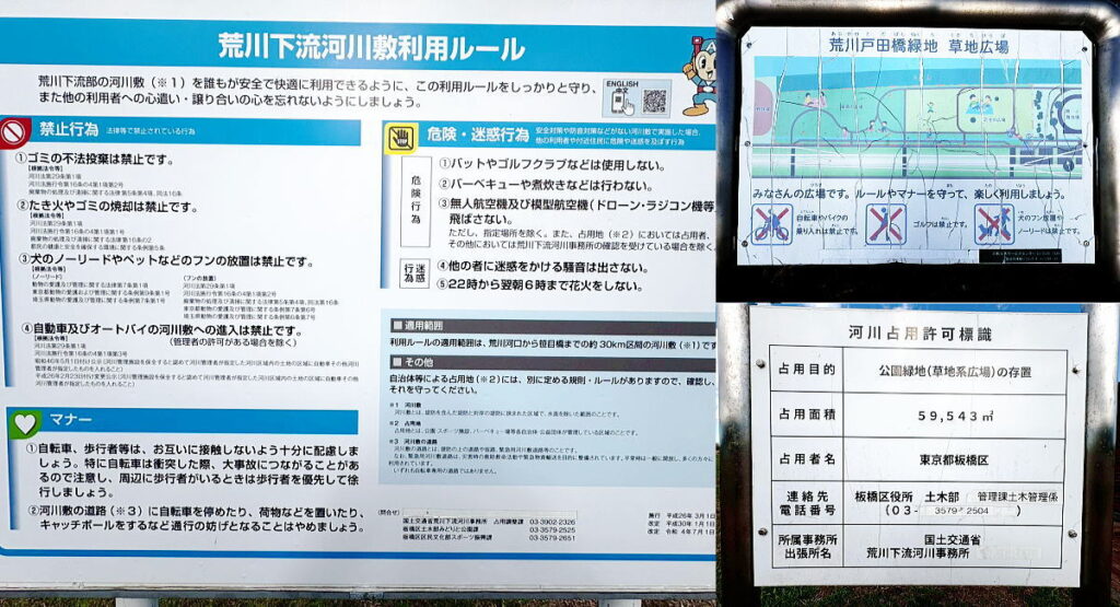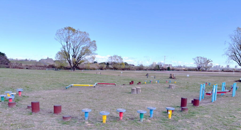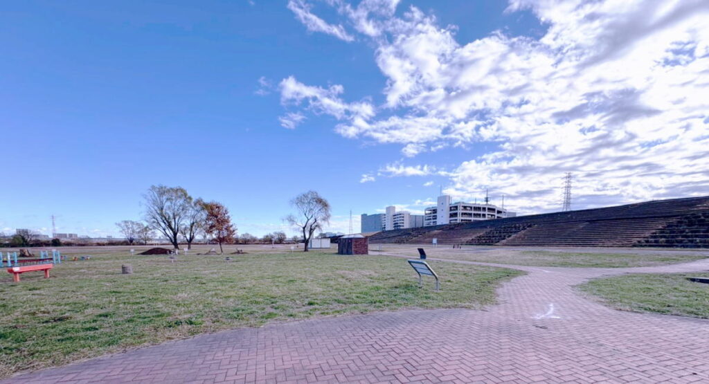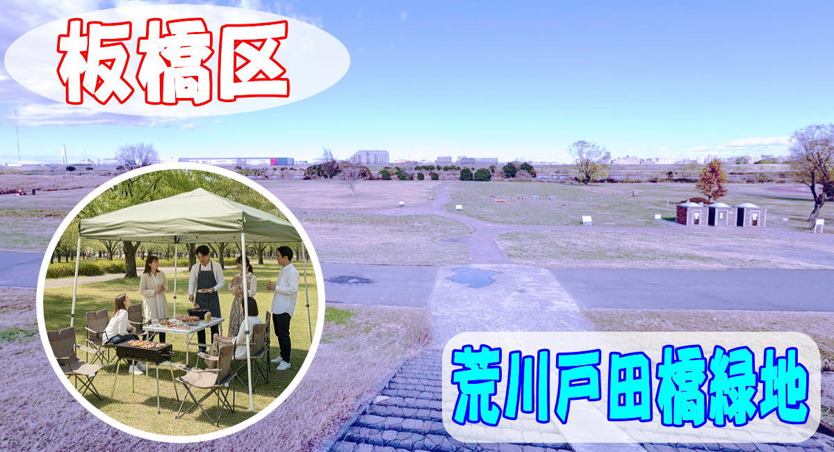 板橋区新河岸の荒川河川敷沿いに広がる緑地公園で、自然豊かな草地広場や水路ふれあいゾーンなどがあり、散策・ピクニック・BBQ などが楽しめるエリアです。芝生広場や遊具もあり、ファミリーやグループでの利用にも向いています。敷地面積は、596,881.00㎡(東京ドーム13個分)となっています。