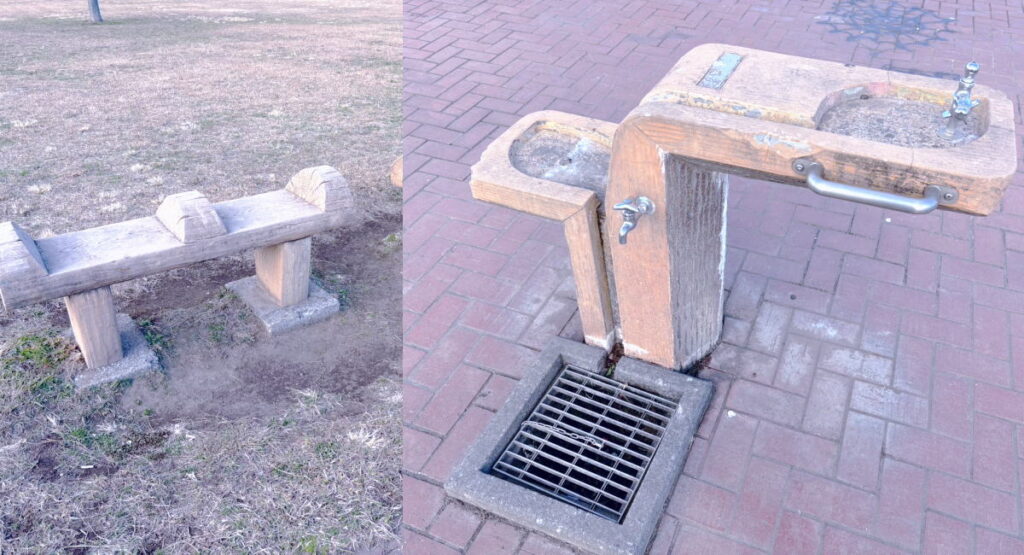 広場には、このようなベンチや手洗い場なども多数設置されています。ハイキングや犬の散歩なんかで来られている方も多い場所です。子供も遊具などがあるので、退屈しのぎにはなるのかなと思います。