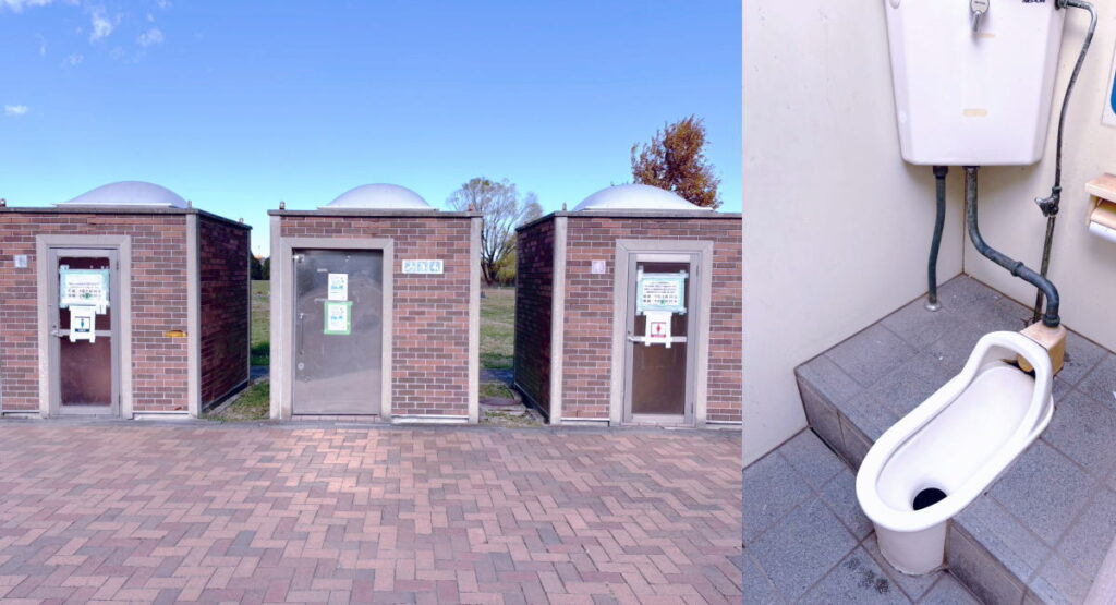 公衆トイレが3個並んで見えます。見て左側が男性、真ん中が障害者用トイレ、右が女性用のトイレです。気になる中なのですが、男性トイレは和式トイレでした(汗)女性の方は、見てないのですが、洋式水洗トイレを願うばかりです。