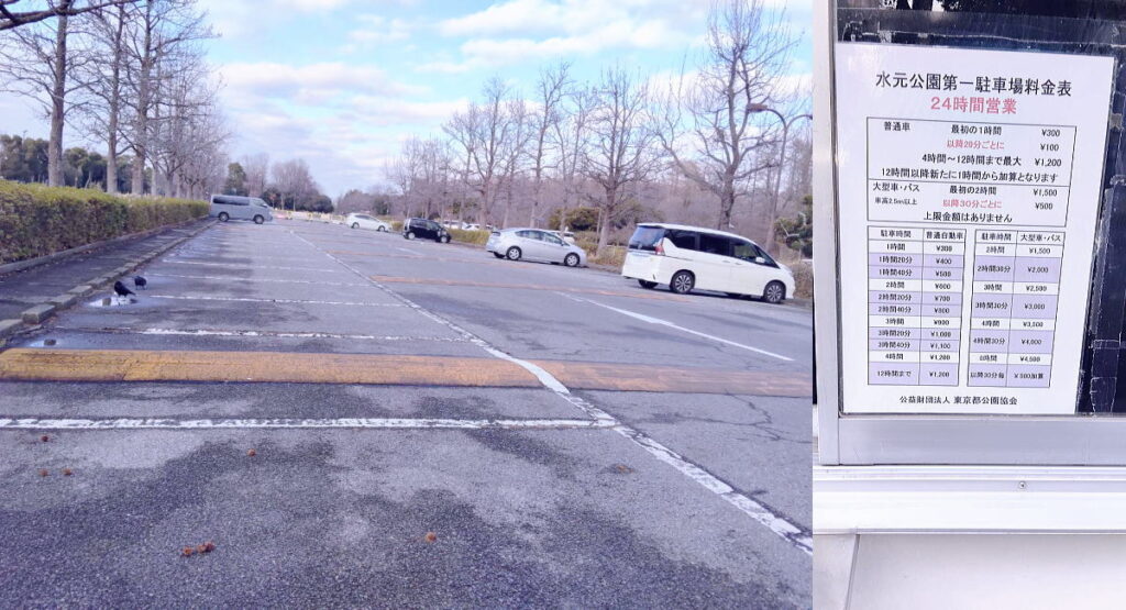 葛飾区にある水元公園第一駐車場に到着しました。駐車場は全部で第一・第二・第三駐車場があります。有料の駐車場になります。最初の1時間は300円、以降20分ごとに100円となります。12時間上限最大は1200円となります。台数は約 287〜311台程度停められるようです。