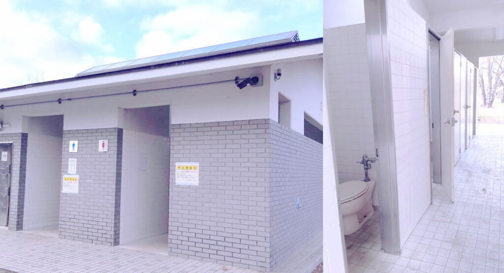 公園内には、公衆トイレが全部で18箇所設置されているようです。こちらはバーベキュー場から近い公衆トイレになります。トイレの中は、洋式水洗トイレですが、ちょっと汚れが目立ちました。でも、使えないということはなさそうです。