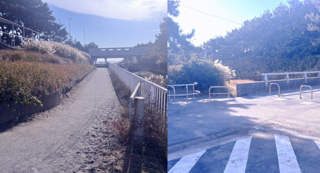 辻堂海浜公園の脇から海岸につながる通路があります。ここを歩いて海岸へ向かいます。※BBQが出来るのは辻堂海浜公園内ではありません。