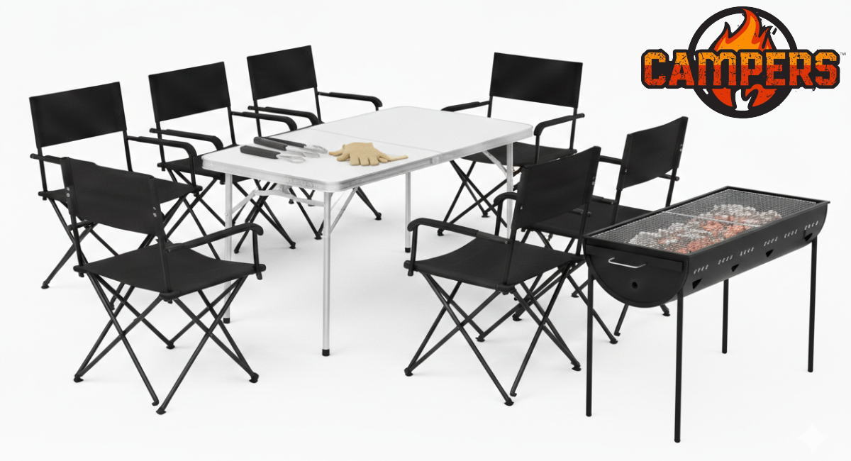 - 機材レンタル(テーブル1基・チェア人数分・BBQコンロ1基・食材用トング1個・炭用トング1個・軍手1個)